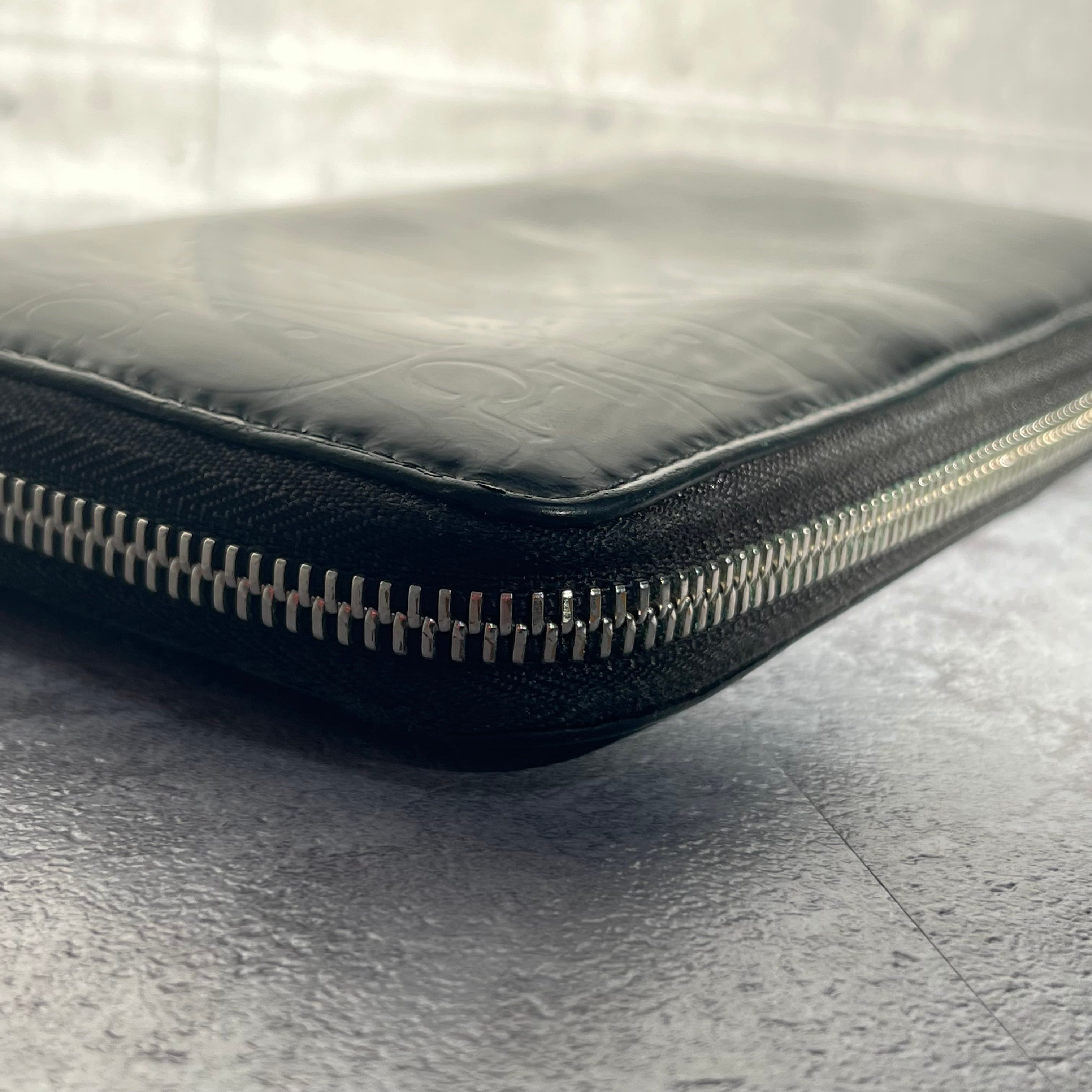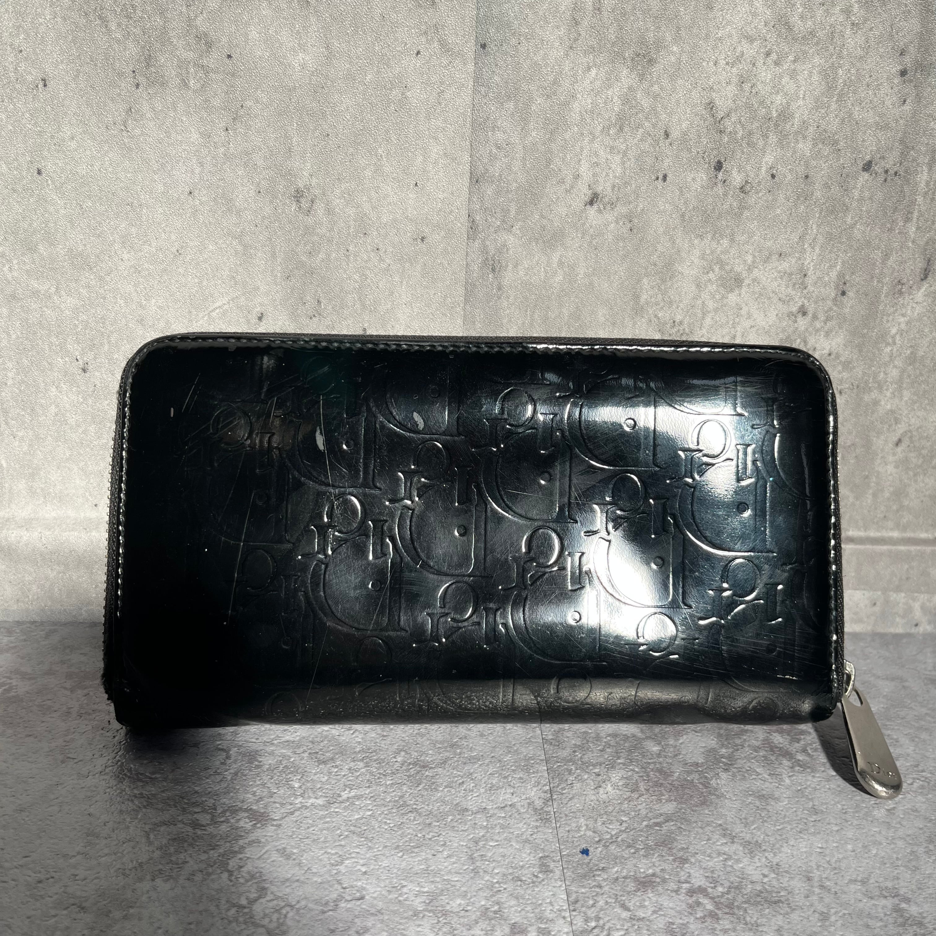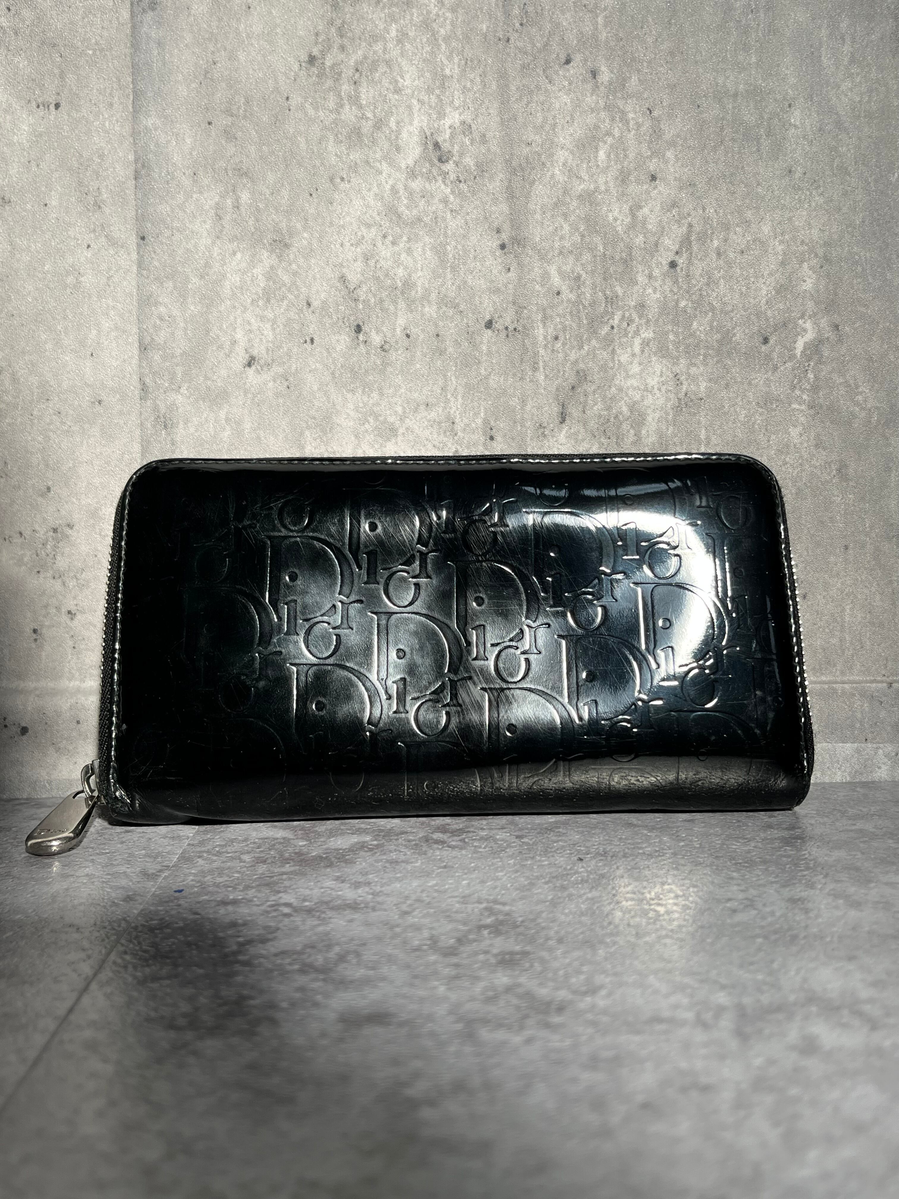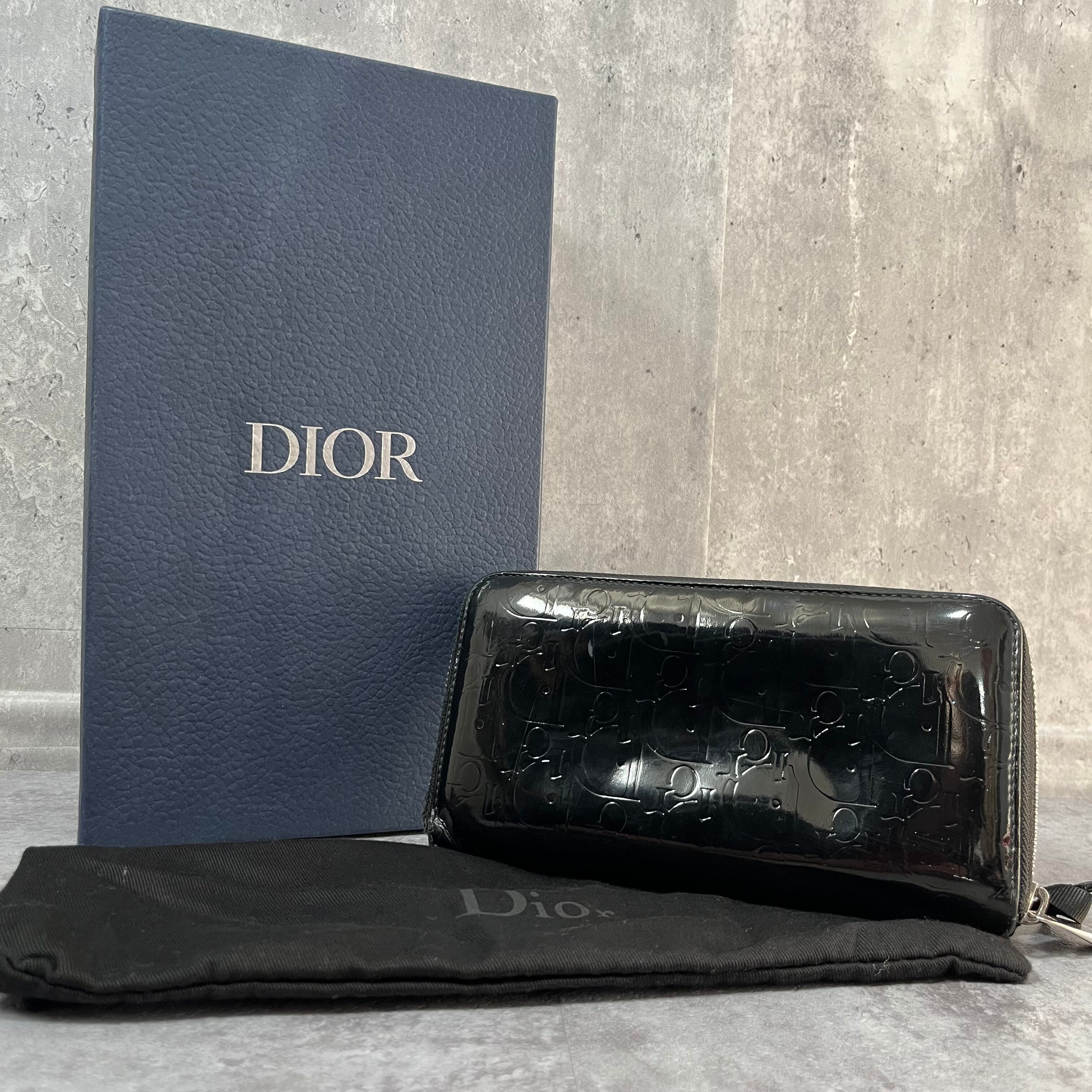 【DIOR】長財布 ラウンドジップ ラウンドファスナー エナメル 光沢 ブラック 黒 ディオール 総ロゴ トロッター ロゴ総柄 箱付き 保存袋付き