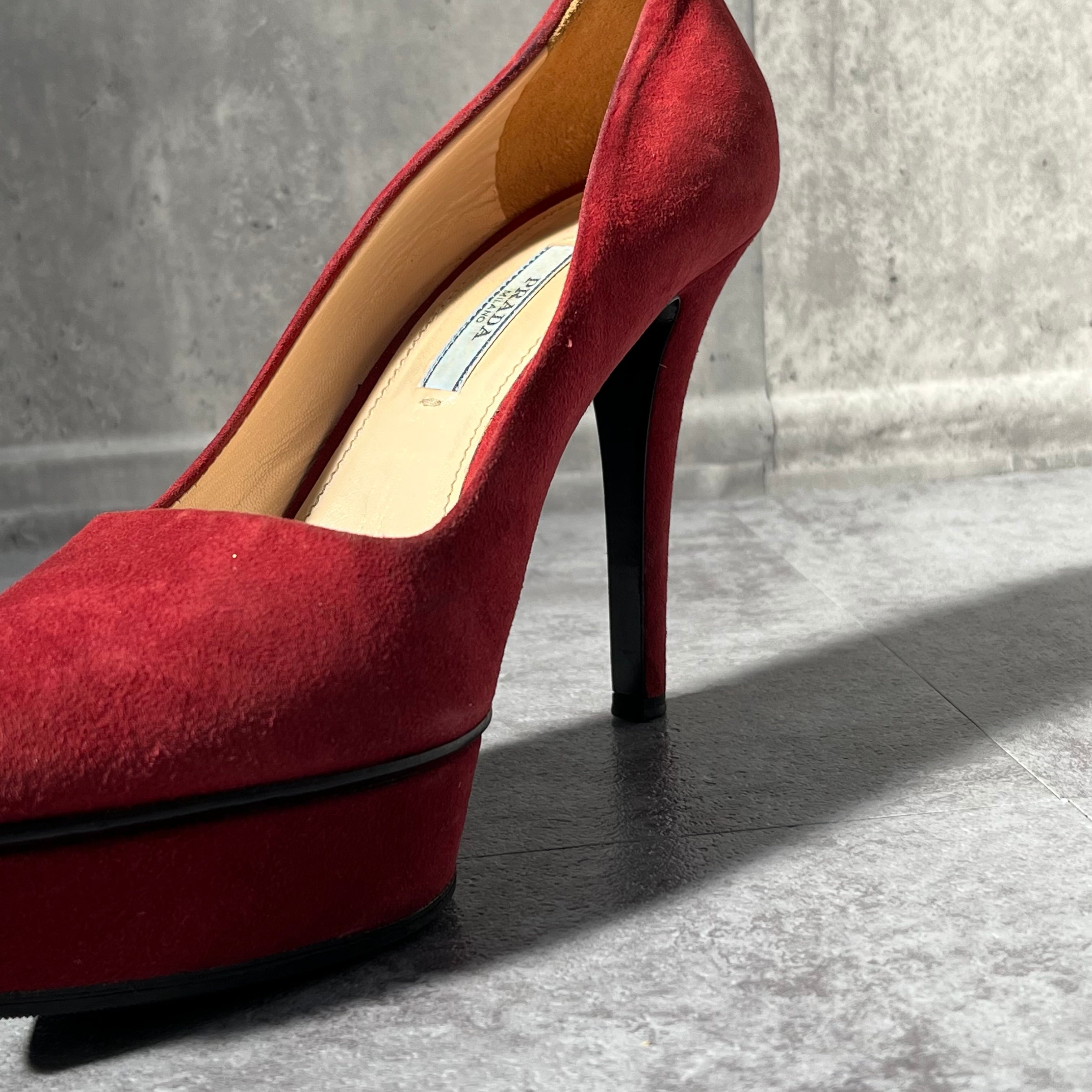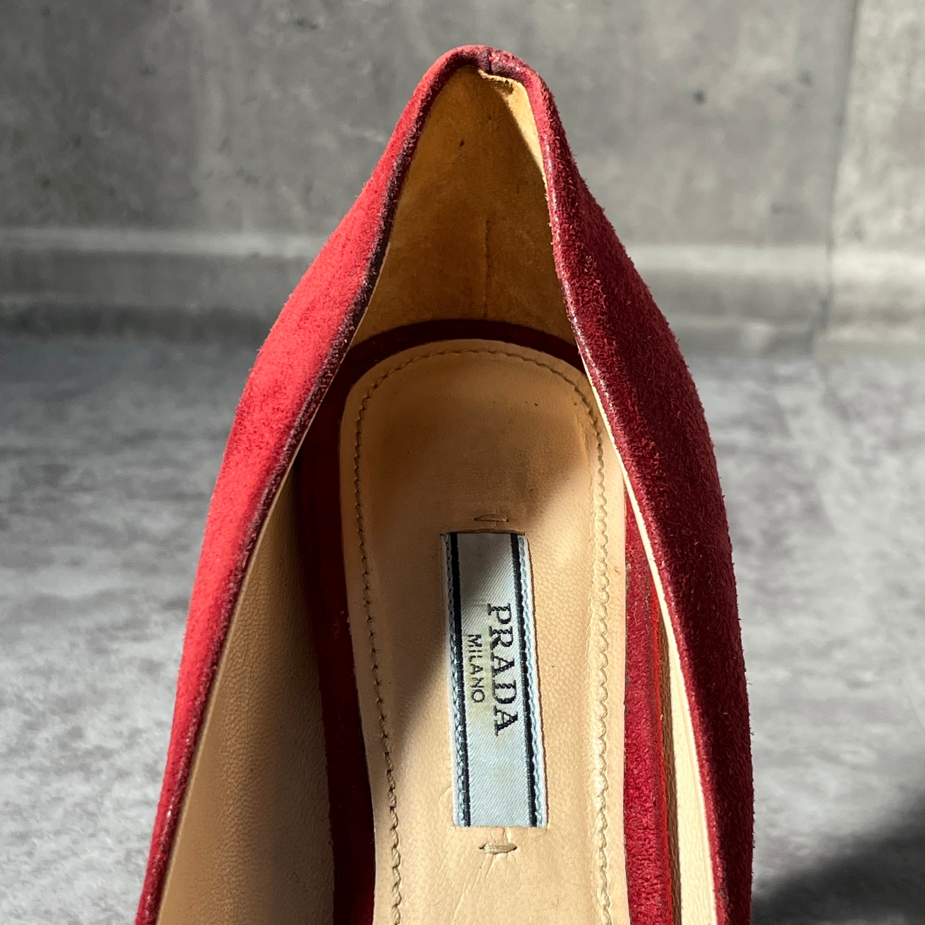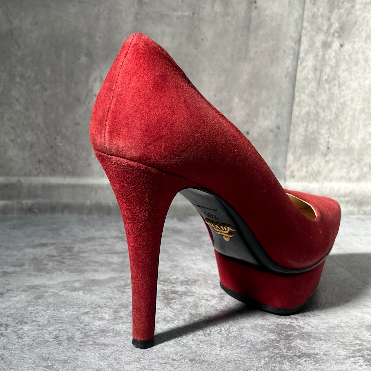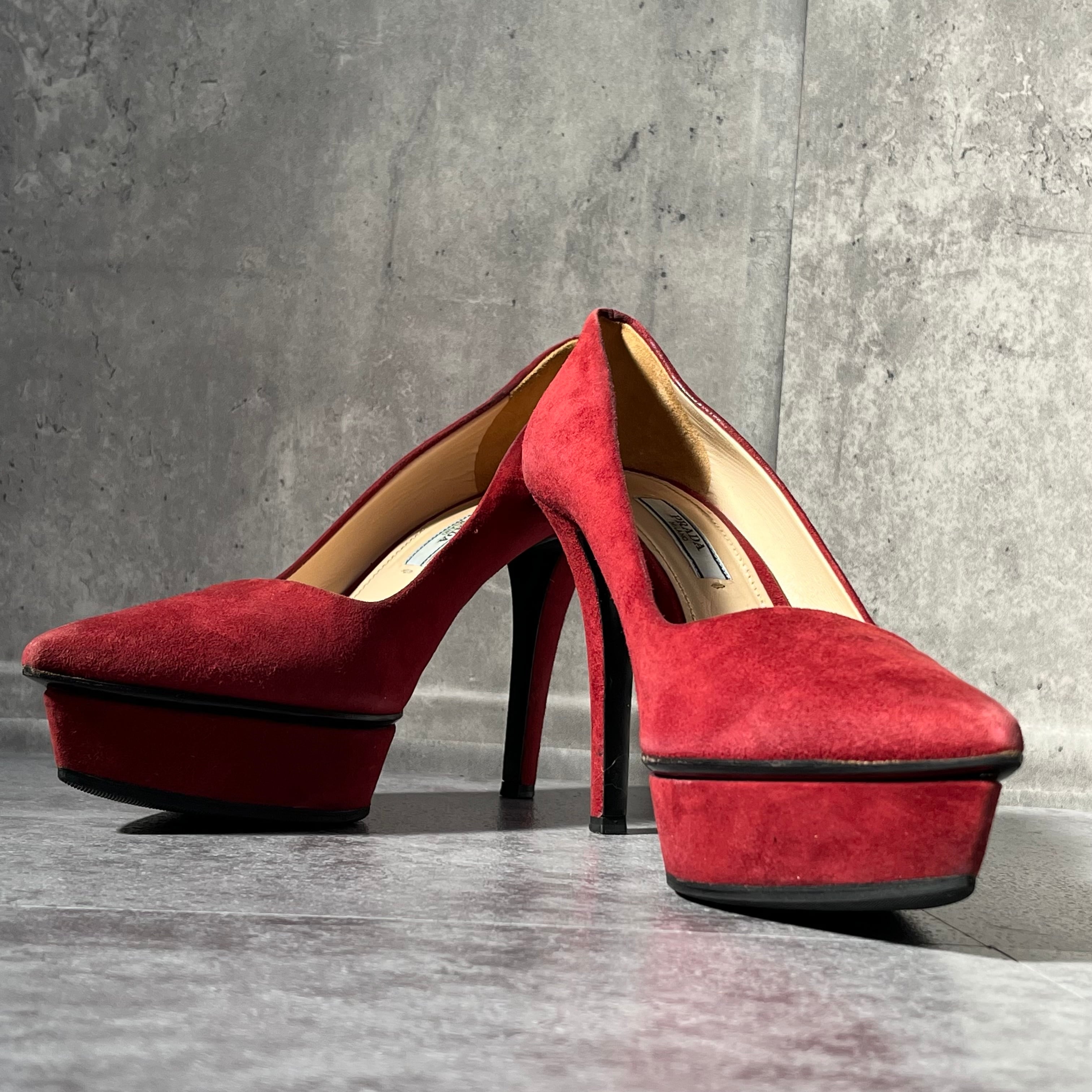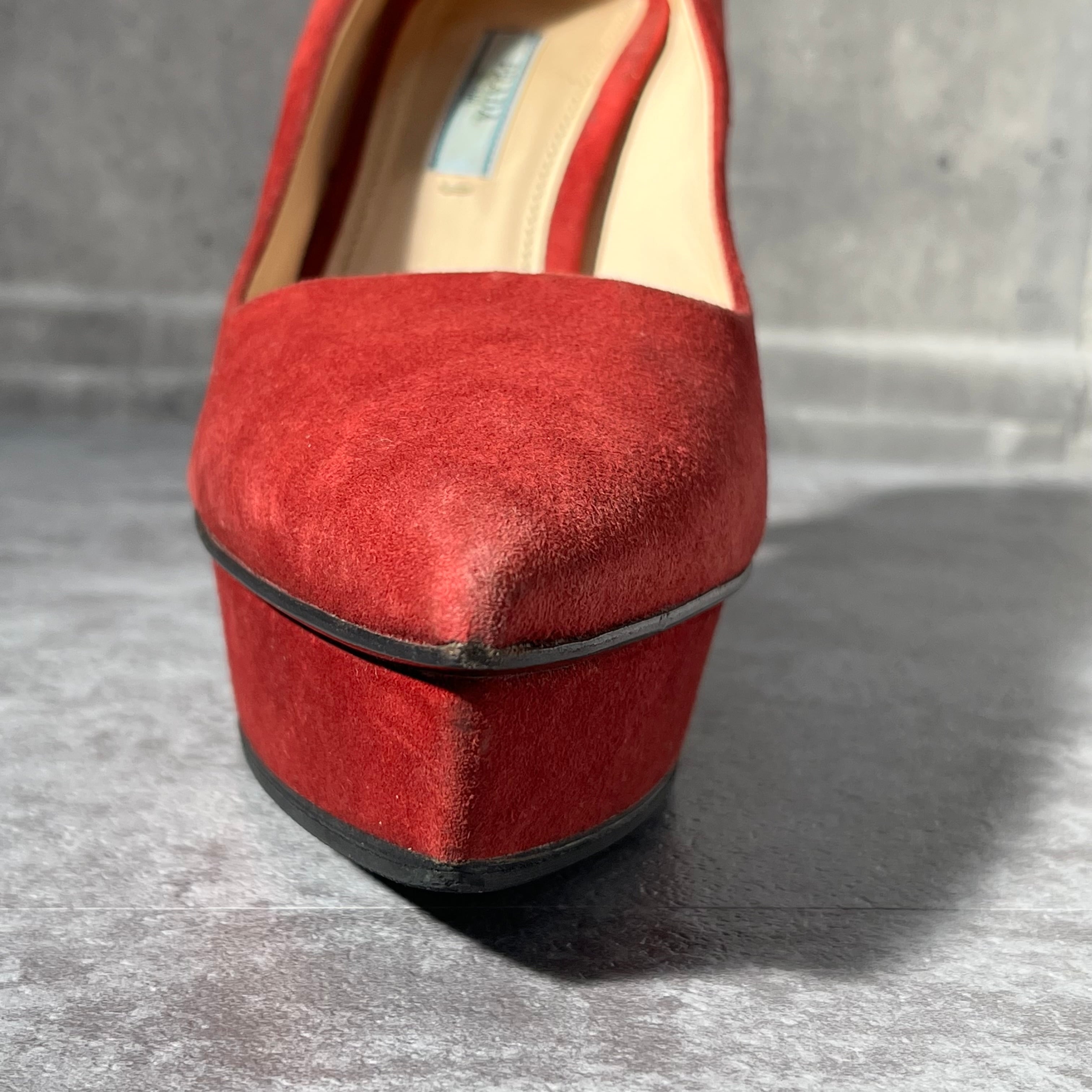 【PRADA】プラダ ハイヒールパンプス レッド スエード 厚底 ピンヒール