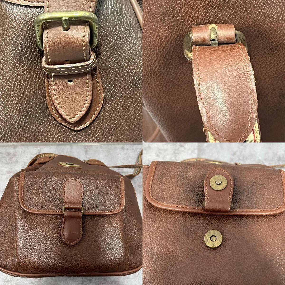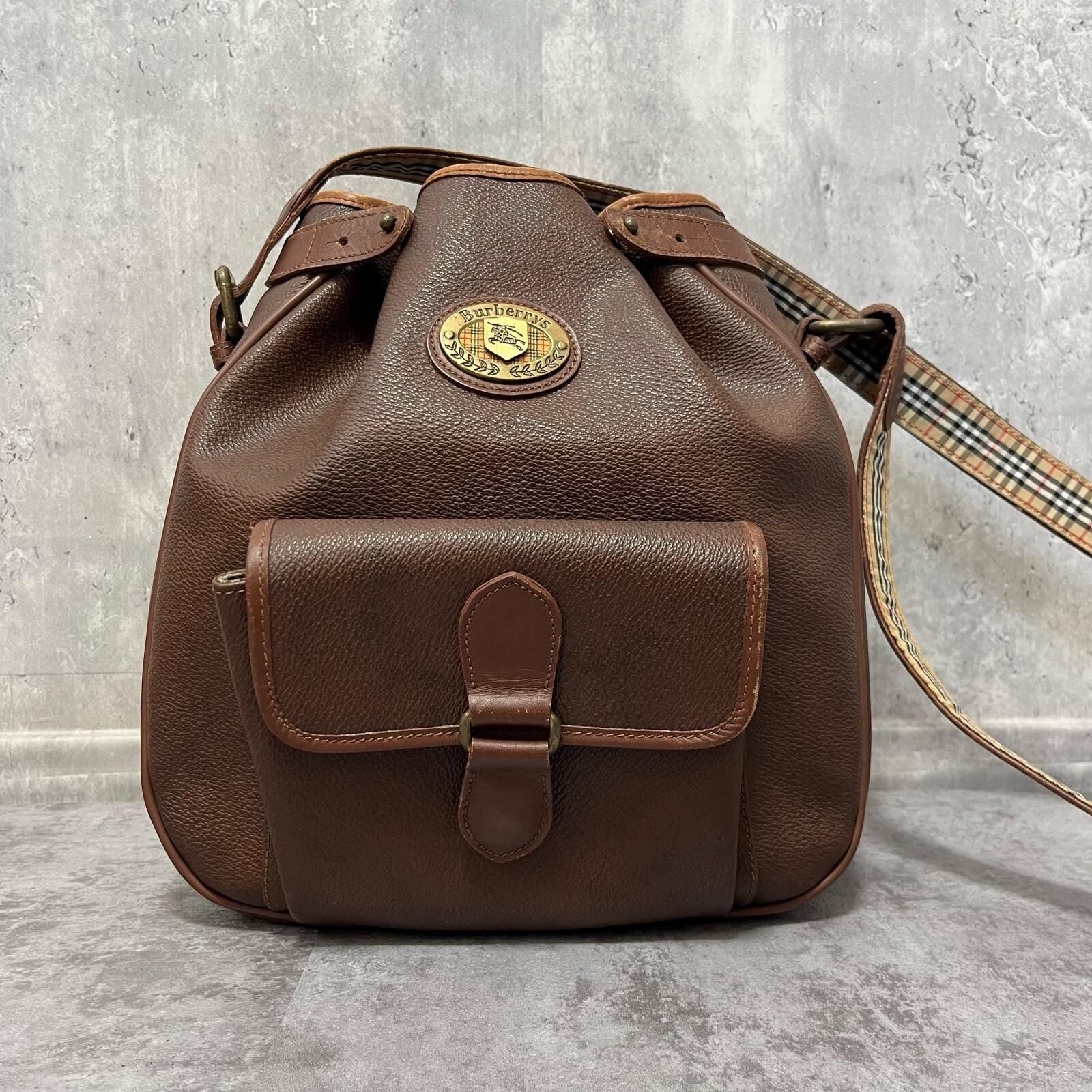【Burberry】バーバリー ショルダーバッグ レザーショルダーバッグ レディース イタリア製 ブラウン 茶色 巾着型 ノバチェックストラップ ロゴ金具 フロントポケット付き オールドバーバリー ヴィンテージバッグ